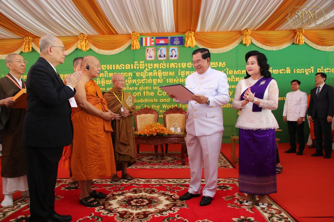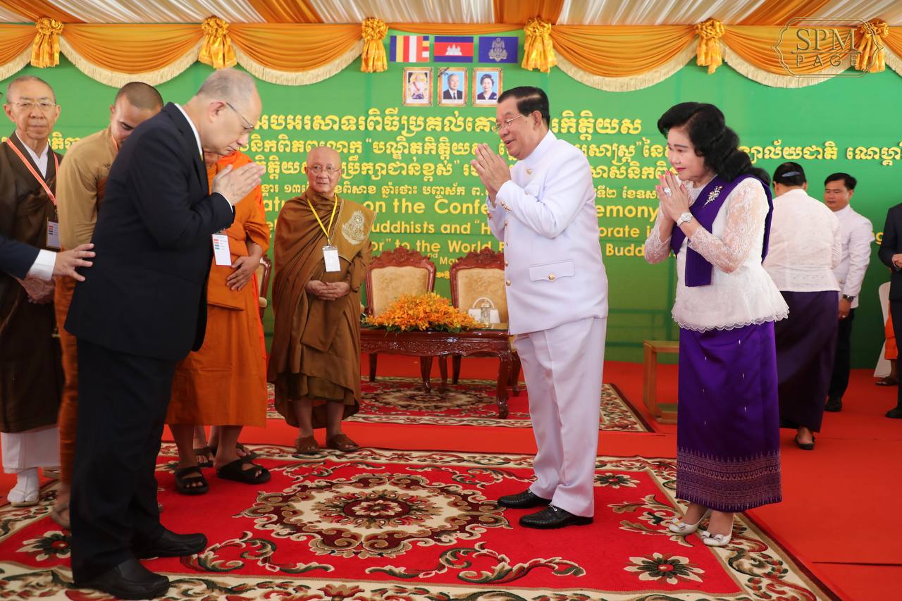 សម្តេចតេជោ ហ៊ុន សែន បានមានប្រសាសន៍សូមថ្លែងអំណរគុណដល់គណៈកម្មាធិការ និងអាជ្ញាធរពាក់ព័ន្ធទាំងអស់ដែលបានរៀបចំពិធីដ៏មហោឡារិក និងសូមសម្តែងនូវ អំណរគុណជូនចំពោះ អង្គការពុទ្ធសាសនិកពិភពលោក និង សកលវិទ្យាល័យជាតិ ណេហ្គរី ប៉ាដាង នៃសាធារណរដ្ឋឥណ្ឌូនេស៊ី ដែលបានជ្រើសរើសថ្ងៃដ៏ពិសិដ្ឋនេះដើម្បីផ្តល់គោរមងារជា «ពុទ្ធមាមកាភិបាល នៃអង្គការពុទ្ធសាសនិកពិភពលោក» និងផ្ដល់សញ្ញាបត្រ «បណ្ឌិតកិត្តិយស ផ្នែកមនុស្សសាស្ត្រ» ជូនដល់សម្តេចនាពេលនេះ។