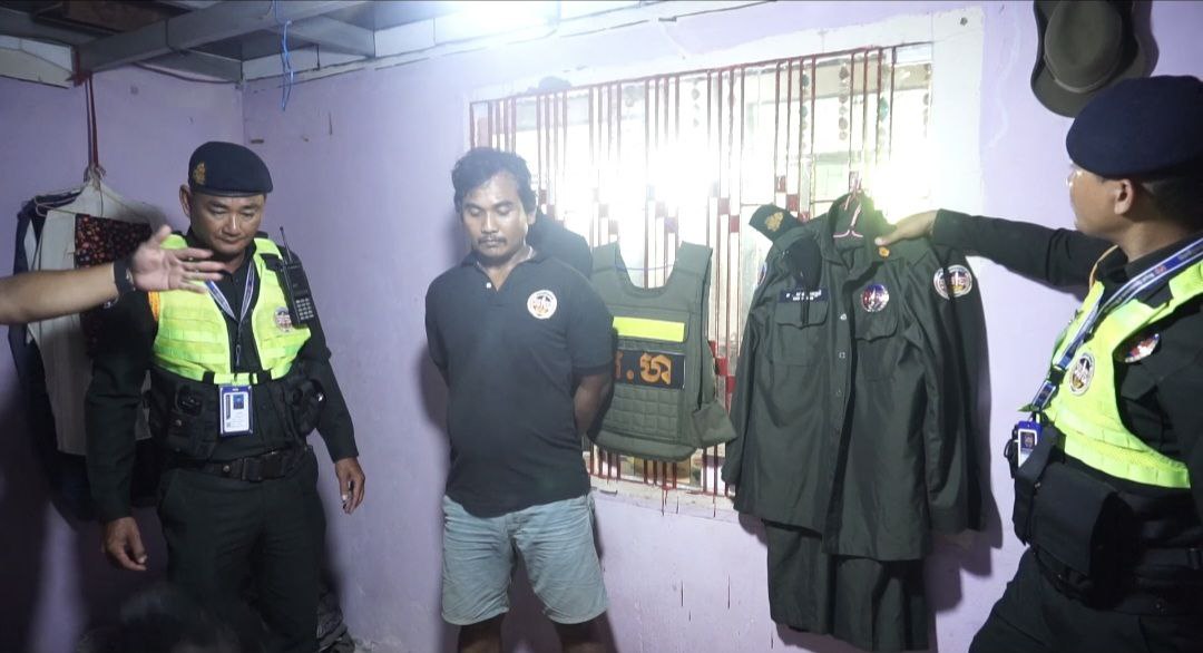 បន្ទាប់ពីបានឃើញព័ត៌មាននេះភ្លាម កម្លាំងមូលដ្ឋានអាវុធហត្ថខណ្ឌសែនសុខ សហការជាមួយ កម្លាំងជំនាញការិយាល័យប្រឆាំងបទល្មើសព្រហ្មទណ្ឌ នៃកងរាជអាវុធហត្ថរាជធានីភ្នំពេញ បានចុះធ្វើការស្រាវជ្រាវរហូតឈានទៅធ្វើការឃាត់ខ្លួនជនសង្ស័យម្នាក់ នៅវេលាម៉ោង១៤៖៣០នាទី ថ្ងៃទី០៦ ខែឧសភា ឆ្នាំ ២០២៣ ត្រង់ចំណុច ផ្ទះលេខ១៦៥ ផ្លូវលំ ក្រុម០៧ ភូមិដីថ្មី សង្កាត់គោកឃ្លាង ខណ្ឌសែនសុខ និងបានរកឃើញថា ជនសង្ស័យរូបនេះ មិនត្រឹមជាសមត្ថកិច្ចក្លែងក្លាយប៉ុណ្ណោះទេ ថែមទាំងថ្លើមធំហ៊ានក្លែងរហូតដល់ លើកស្លាក មូលដ្ឋានកងរាជអាវុធហត្ថរាជធានីភ្នំពេញ នៅផ្ទះរបស់ខ្លួនទៀតផង។
