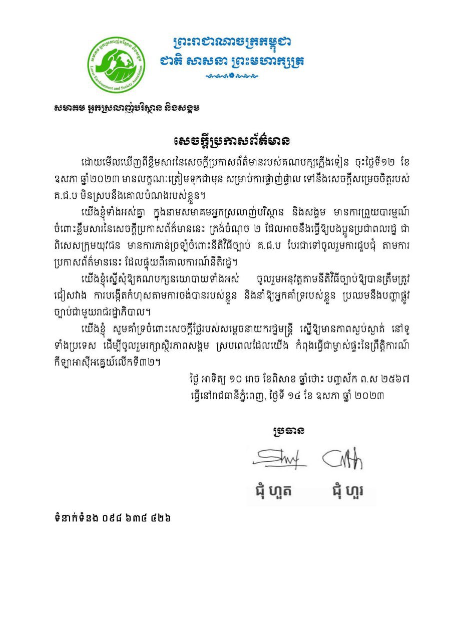 លោក ជុំ ហួត និង ជុំ ហួរ ប្រធានសមាគម អ្នកស្រឡាញ់បរិស្ថាន និងសង្គម ចាត់ទុកខ្លឹមសារនៃសេចក្ដីប្រកាសព័ត៌មានរបស់គណបក្សភ្លើងទៀន ចុះថ្ងៃទី១២ ខែឧសភា ឆ្នាំ២០២៣ មានលក្ខណៈត្រៀមទុកជាមុន សម្រាប់ការផ្ចាញ់ផ្ចាល ទៅនឹងសេចក្តីសម្រេចចិត្តរបស់ គ.ជ.ប មិនស្របនឹងគោលបំណងរបស់ខ្លួន។