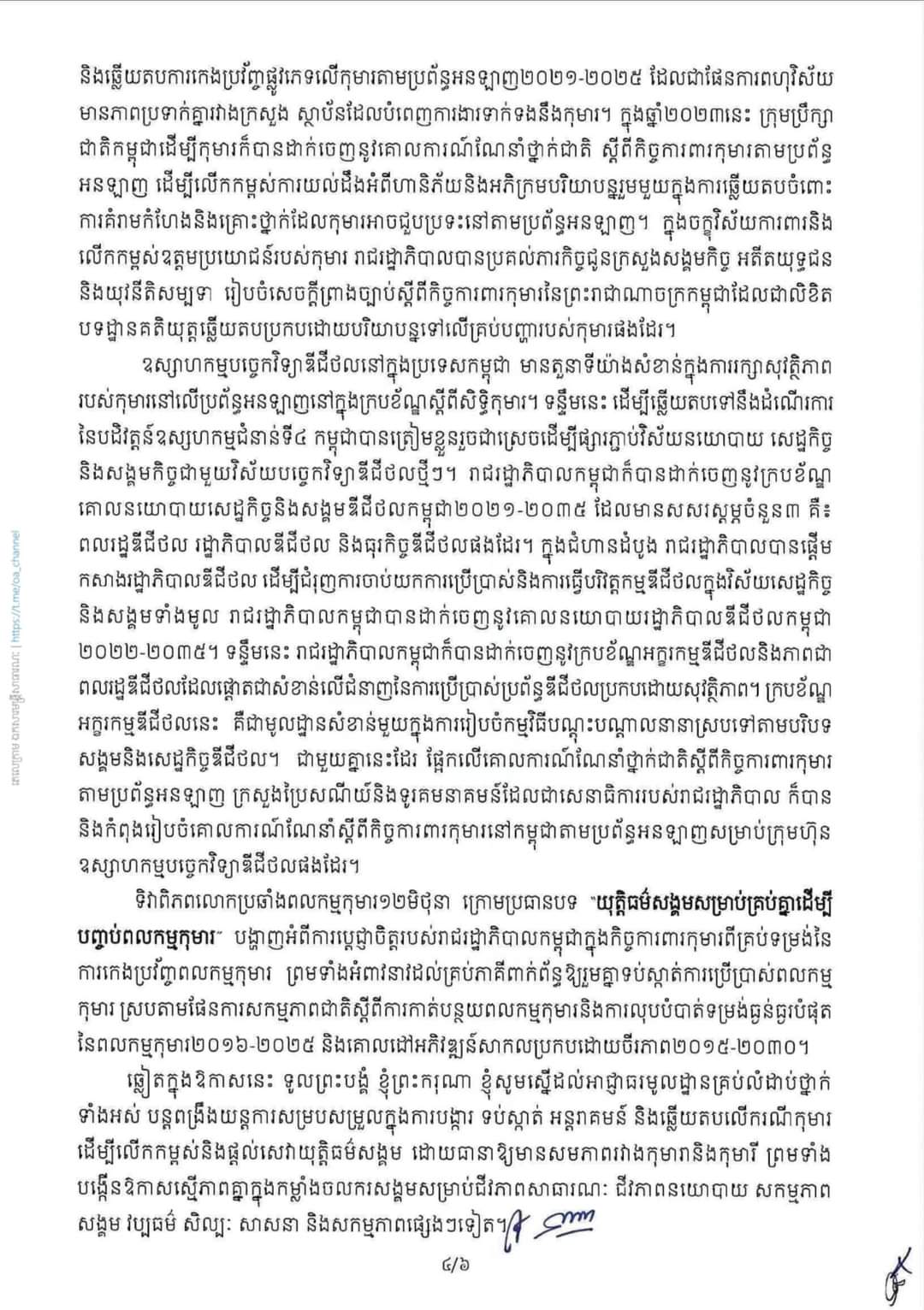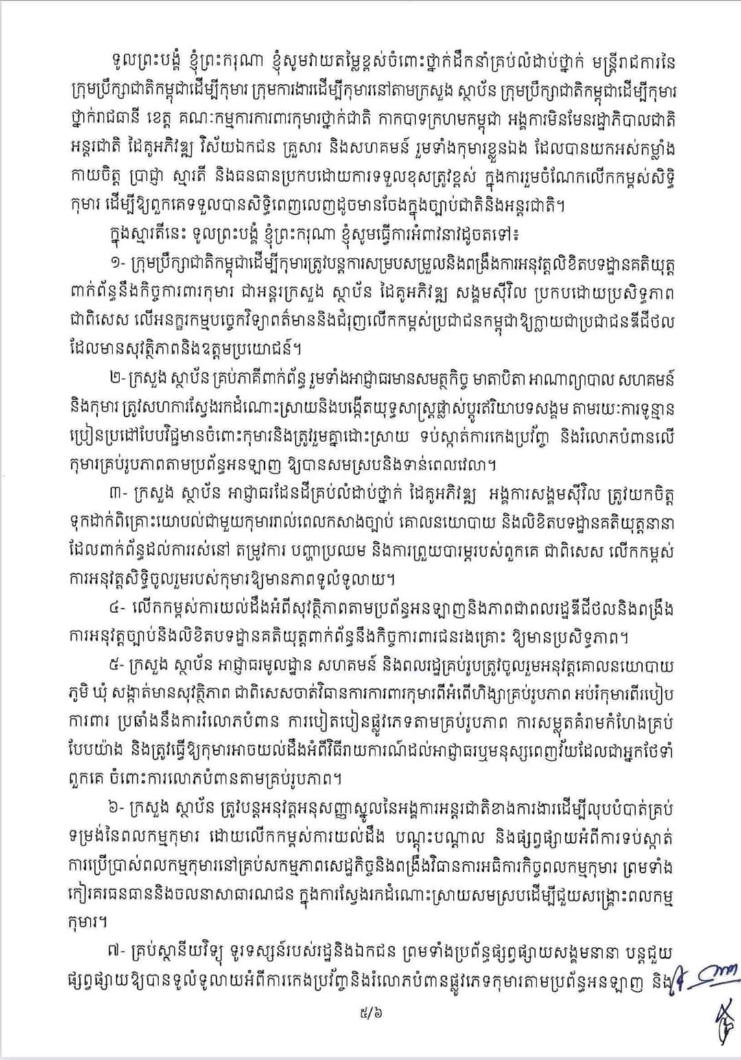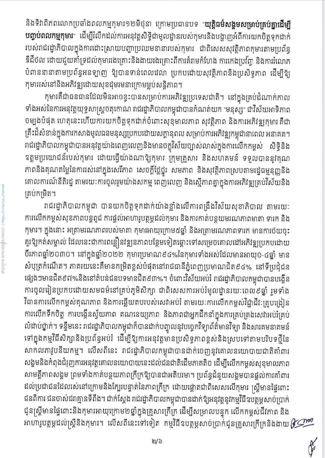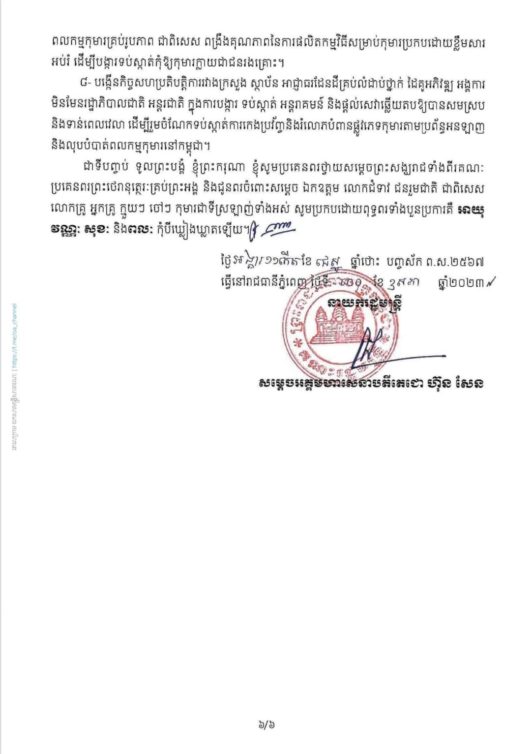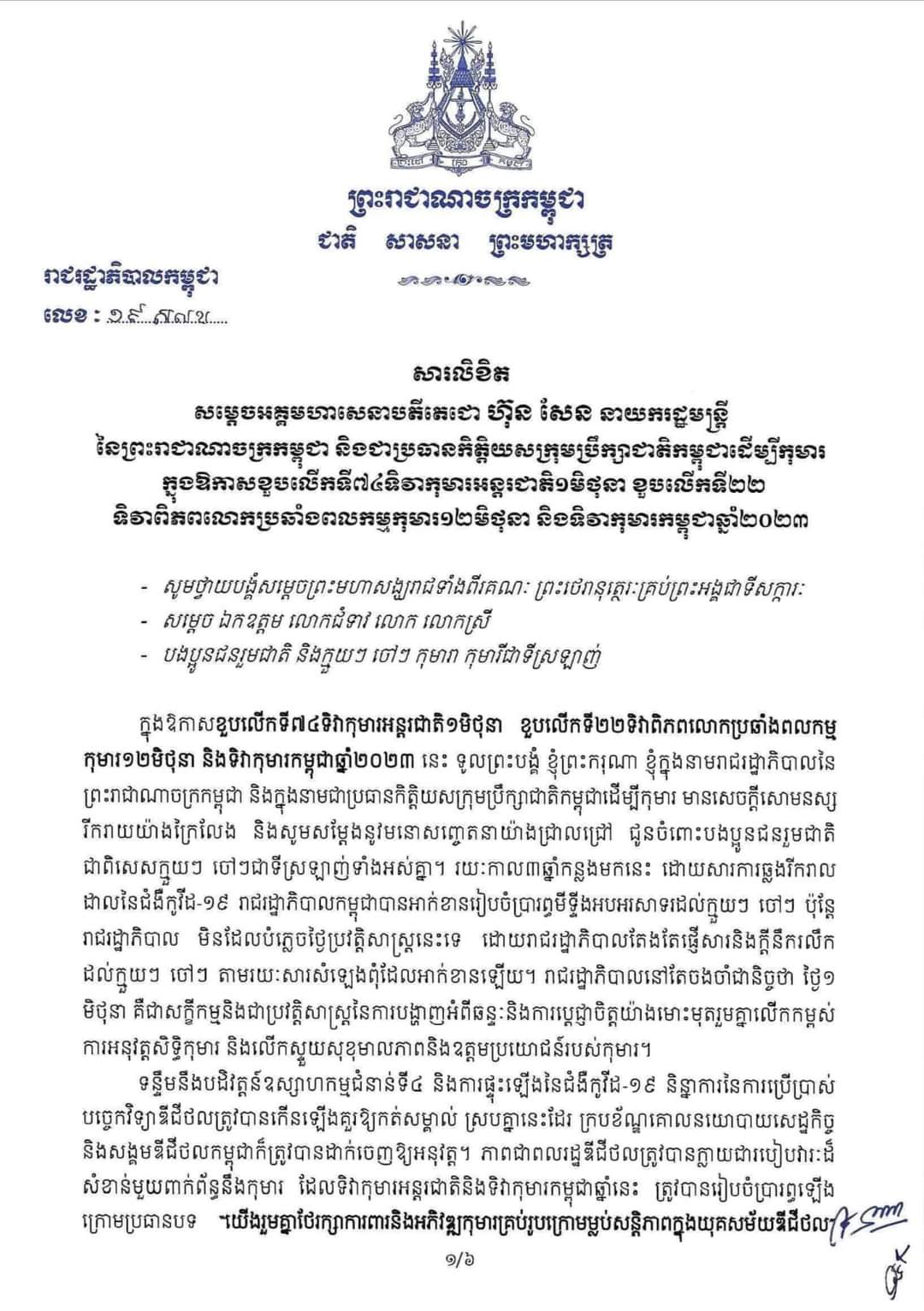 សារលិខិត សម្ដេចអគ្គមហាសេនាបតីតេជោ ហ៊ុន សែន នាយករដ្ឋមន្ត្រីនៃព្រះរាជាណាចក្រកម្ពុជា និងជាប្រធាន កិត្តិយសក្រុមប្រឹក្សាជាតិដើម្បីកុមារ ក្នុងឱកាសខួបលើកទី៧៤ ទិវាកុមារអន្តរជាតិ១មិថុនា ខួបលើកទី២២ ទិវាពិភពលោកប្រឆាំងពលកម្មកុមារ១២មិថុនា និងទិវាកុមារកម្ពុជាឆ្នាំ២០២៣។