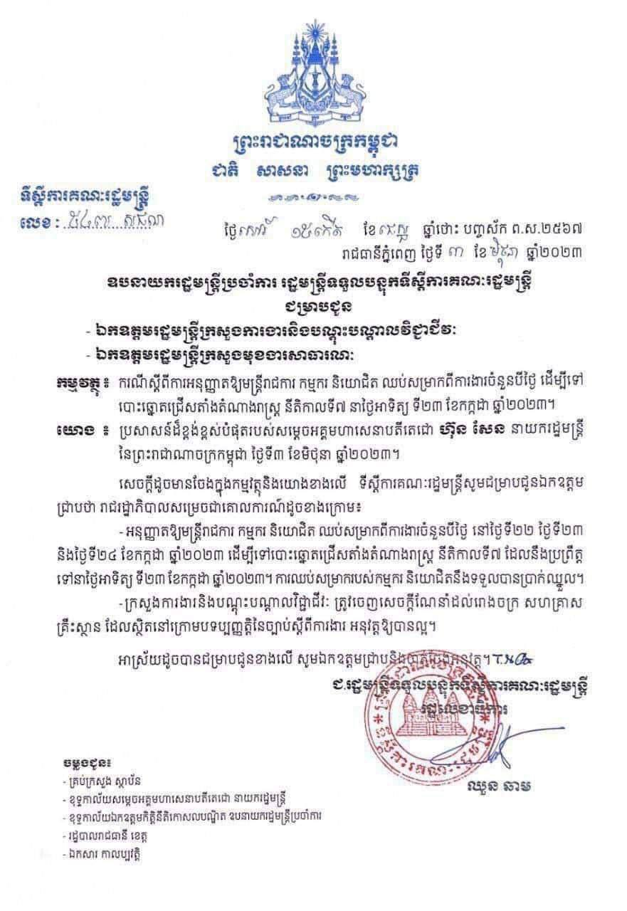 ប្រមុខរាជរដ្ឋាភិបាល សម្តេចតេជោ​ ហ៊ុន​ សែន​ នាយករដ្ឋមន្ត្រីនៃព្រះរាជាណាចក្រកម្ពុជា បានសម្រេច​ អនុញ្ញាតឲ្យមន្ត្រីរាជការ កម្មករ និយោជិត ឈប់សម្រាកពីការងារចំនួនបីថ្ងៃ គឺថ្ងៃទី២២​ ថ្ងៃទី២៣​ និងថ្ងៃទី២៤ ខែកក្កដា​ ឆ្នាំ២០២៣​ ដើម្បីទៅបោះឆ្នោតជ្រើសតាំងតំណាងរាស្ត្រ នីតិកាលទី៧ ដែលប្រព្រឹត្តទៅនាថ្ងៃអាទិត្យ ទី២៣ ខែកក្កដា ឆ្នាំ២០២៣។ ការឈប់សម្រាករបស់ម្មករ​ និយោជិតនឹងទទួលបានប្រាក់ឈ្នួល៕