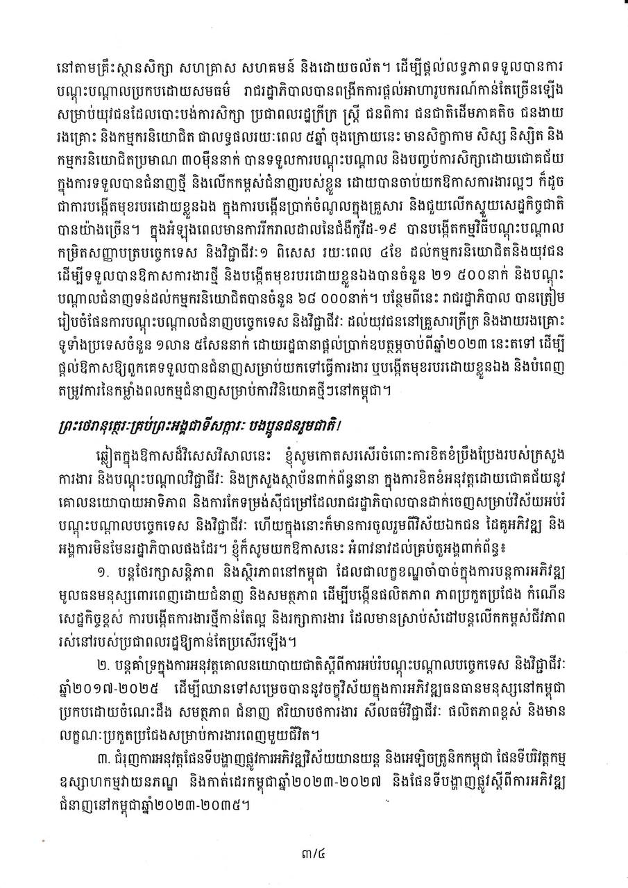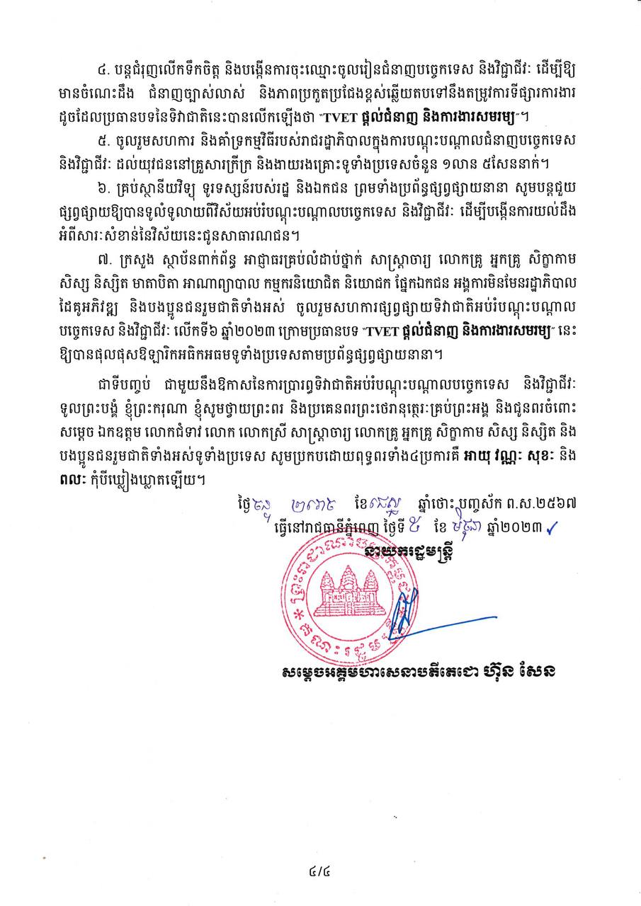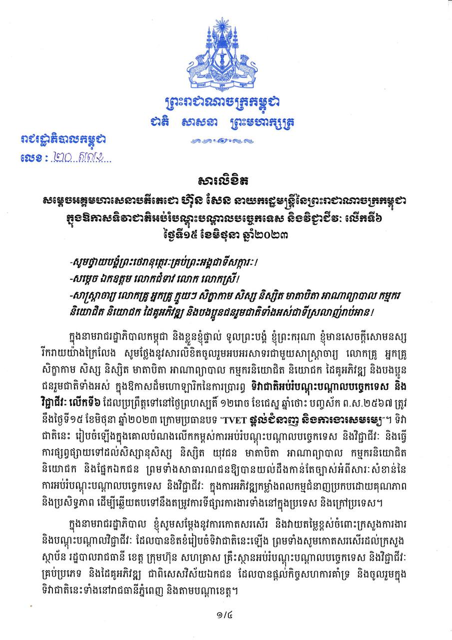 សារលិខិត សម្តេចអគ្គមហាសេនាបតីតេជោ ហ៊ុន សែន នាយករដ្ឋមន្ត្រីនៃព្រះរាជាណាចក្រកម្ពុជា ក្នុងឱកាសទិវាជាតិអប់រំបណ្តុះបណ្តាលបច្ចេកទេស និងវិជ្ជាជីវៈ លើកទី៦ ថ្ងៃទី១៥ ខែមិថុនា ឆ្នាំ២០២៣។