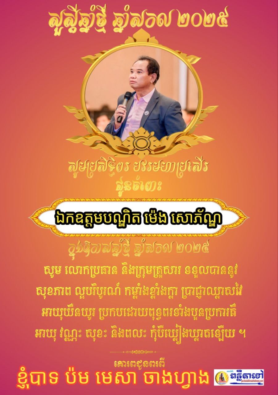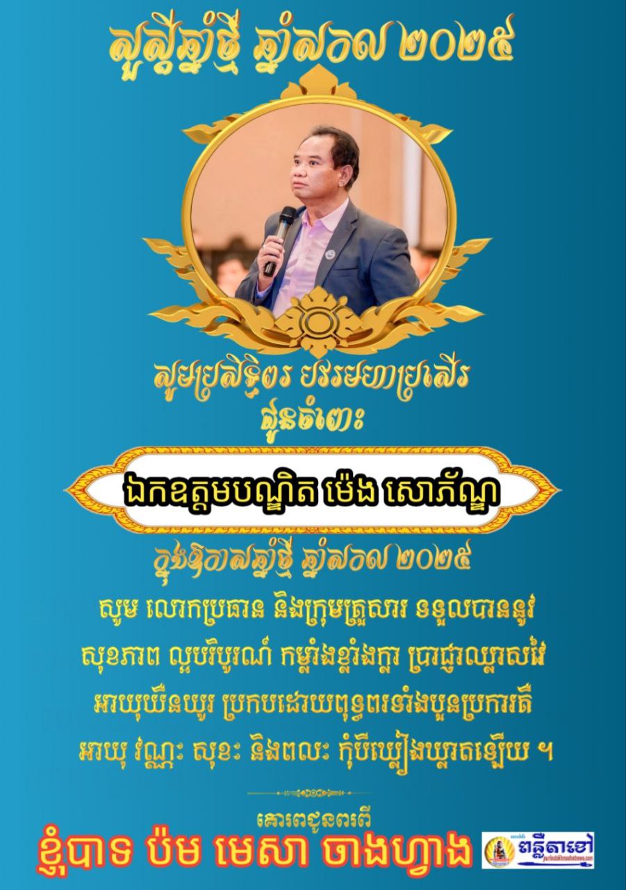 សូមបួងសួងដល់វត្ថុស័ក្ដិសិទ្ធក្នុងលោក និងទេវតាឆ្នាំថ្មីប្រសិទ្ធិពរជ័យជូនចំពោះ ឯកឧត្តមបណ្ឌិត ម៉េង សោភ័ណ្ឌ អគ្គនាយកស្ថានីយទូរទស្សន៍ អឹម អេស ជេ ធីវី MSJ TV និងលោកជំទាវ ព្រមទាំងក្រុមគ្រួសារសូមមានសុខភាពល្អបរិបូរ ប្រាជ្ញាឈ្លៀសវៃ កំលាំងពលមាំមួនទទួលបានជោគជ័យគ្រប់ភារកិច្ចការងារ និងពុទ្ធពរទាំងបួនប្រការ អាយុរ វណ្ណះ សុខះ ពលះ កុំបីឃ្លៀងឃ្លាតឡើយ។