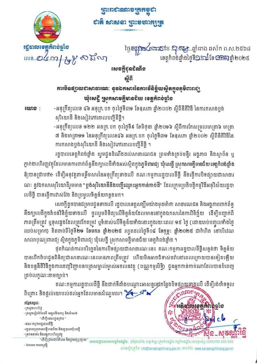 រដ្ឋបាលខេត្តកំពង់ឆ្នាំង ចេញសេចក្ដីជូនដំណឹងស្តីពីការបិទផ្សាយជាសាធារណៈនូវឯកសារនៃការវិនិច្ឆ័យ សម្រាប់ការចុះបញ្ជីដីធ្លីមានលក្ខណ:ជាប្រព័ន្ធ របស់ភូមិពារាជ្យ ឃុំសេដ្ឋី ស្រុកសាមគ្គីមានជ័យ ខេត្តកំពង់ឆ្នាំង រយ:ពេល ១៥ថ្ងៃ (ចាប់ពីថ្ងៃទី២១ ខែមករា ឆ្នាំ២០២៥ រហូតដល់ថ្ងៃទី៤ ខែកុម្ភៈ ឆ្នាំ២០២៥ ដោយគិតទាំងថ្ងៃឈប់សម្រាក) នៅបរិវេណសាលាបុណ្យពារាជ្យ ស្ថិតក្នុងភូមិពារាជ្យ ឃុំសេដ្ឋី ស្រុកសាមគ្គីមានជ័យ ខេត្តកំពង់ឆ្នាំង!