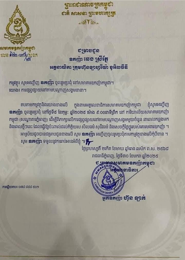 ឧកញ៉ា ឆេង ស្រីរ័ត្ន ហៅ Love Riya ត្រូវបានសមត្ថកិច្ច ក្រសួងមហាផ្ទៃ និងសមាគមឧកញ៉ាកម្ពុជា បានចេញលិខិតដាច់ដោយឡែកពីគ្នា កោះហៅ និងអញ្ជើញ ចូលបំភ្លឺនៅម៉ោង០៩ព្រឹកថ្ងៃទី០៥ ខែកុម្ភៈ ឆ្នាំ២០២៥ ស្អែកនេះដូចគ្នា ។ ការកោះហៅនេះ នៅលើបណ្តាញសង្គមមួយចំនួនបានផ្សព្វផ្សាយថា ឧកញ៉ារូបនេះ បានលួចសមិទ្ធផលអ្នកដទៃ ដើម្បីយកទៅស្នើសុំគោរមងារជា«ឧកញ៉ា» ៕