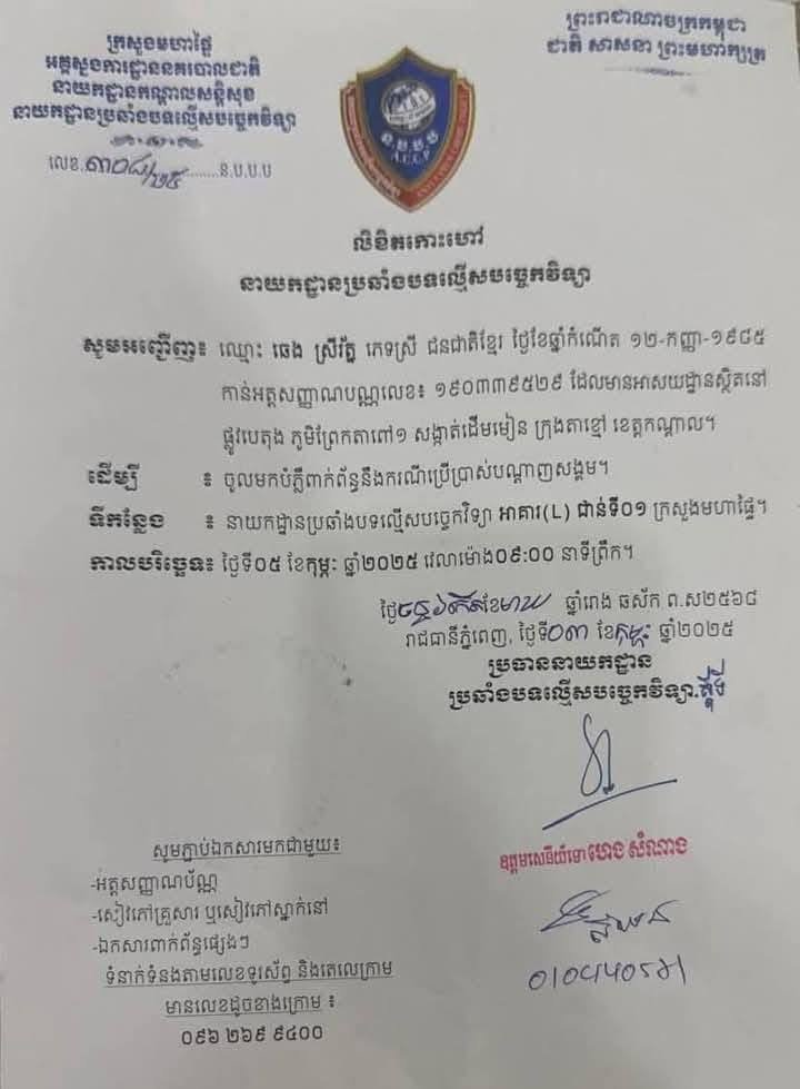 សមាគមឧកញ៉ាកម្ពុជានិង សមត្ថកិច្ចនាយកដ្ឋានប្រឆាំងបទល្មើសបច្ចេកវិទ្យានៃក្រសួងមហាផ្ទៃនៅព្រឹកថ្ងៃនេះ ០៥ ខែគុម្ភៈឆ្នាំ២០២៥វេលាម៉ោង ០៩:០០នាទីកោះហៅ ឈ្មោះ ឆេង ស្រីរ័ត្ន ហៅ Love Riya ចូលខ្លួនដើម្បី….
