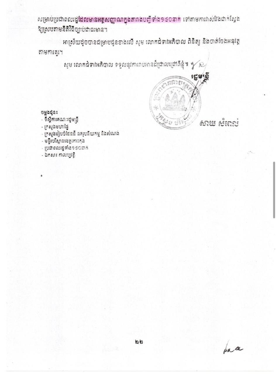 (កោះកុង) លោក ម៉ក់ រដ្ឋា ដែលមានឈ្មោះក្នុងចំណោមប្រជាពលរដ្ឋ 140គ្រួសារប្រាប់សារព័ត៌មានយើងថា! លោកមានលិខិតកាន់កាប់ដីចំនួន2 1មានទំហំ ទទឹង20ម៉ែត្រ គុណបណ្ដោយ100ម៉ែត្រ 2 ទំហំ ទទឹង100ម៉ែត្រ គុណនិងបណ្ដោយ 270ម៉ែត្រ អាស្រ័យផលដីនៅភូមិស្ទឹងវែង សង្កាត់ស្ទឹងវែង ក្រុងខេមរភូមិន្ទខេត្តកោះកុង ស្នើសុំដល់ លោក អាយ សុភីរិទ្ធិ ភូមិបាលក្រុង លោក ភូថង សេរីវឌ្ឌី អភិបាលក្រុង និងលោកជំទាវ មិថុនា ភូថង អភិបាលនៃគណៈអភិបាលខេត្តកោះកុង មេត្តាសូមចាត់មន្ត្រីជំនាញពាក់ព័ន្ធទាំងអស់ជួយចុះពិនិត្យទីតាំងដីដែលស្ថិតនៅក្រោយវត្តបាងកាយ៉ាកភូមិស្ទឹងវែង សង្កាត់ស្ទឹងវែង ក្រុងខេមរភូមិន្ទ មាន បុគ្គលមានលុយ មានអំណាច បានលួចកាប់ទន្ទ្រានព្រៃកោងកាងនៅជាប់ដីរបស់គាត់រហូតដល់មាត់ព្រែក និងបោះបង្គោលយកផ្លូវ ដែលជាផ្លូវសម្រាប់ប្រជាពលរដ្ឋ អាស្រ័យផល។