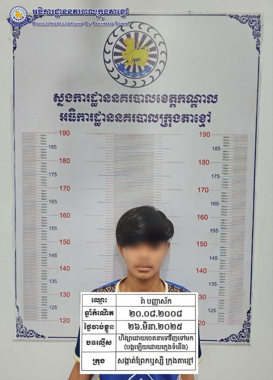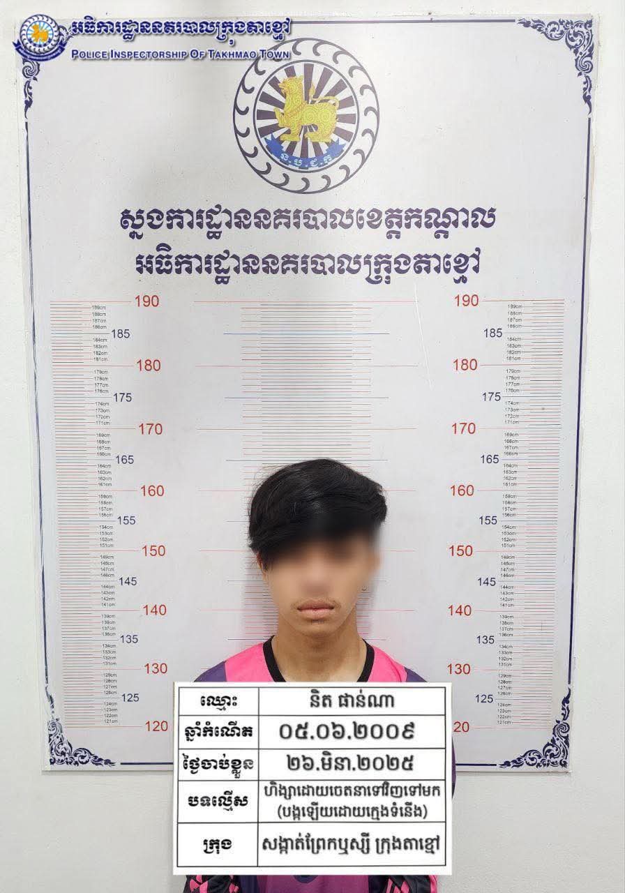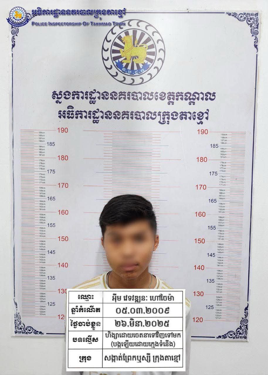 ដោយអនុវត្តតាមបទបញ្ជារបស់ លោកឧត្តមសេនីយ៍ទោ ឈឿន សុចិត្ត ស្នងការ នៃស្នងការដ្ឋាននគរបាលខេត្តកណ្តាល នៅព្រឹកថ្ងៃទី២៦ ខែមីនា ឆ្នាំ២០២៥ កម្លាំងនគរបាលនៃអធិការដ្ឋាននគរបាលក្រុងតាខ្មៅ ដឹកនាំបញ្ជាដោយលោកវរសេនីយ៍ឯក យី វណ្ណដា អធិការនគរបាលក្រុងតាខ្មៅ ផ្នែកនគរបាលព្រហ្មទណ្ឌក្រុងតាខ្មៅ សហការជាមួយ ប៉ុស្តិ៍នគរបាលរដ្ឋបាលព្រែកឬស្សី រួមនឹង ប៉ុស្តិ៍នគរបាលរដ្ឋបាលដើមមៀន ស្រាវជ្រាវតាមនីតិវិធីជំនាញ រហូតឃាត់ខ្លួនបានយុវជនចំនួន០៥នាក់ ពាក់ព័ន្ធករណីហិង្សាដោយចេតនាទៅវិញទៅមក(បង្កឡើងដោយក្មេងទំនើង) កើតហេតុថ្ងៃទី២៦ ខែមីនា ឆ្នាំ២០២៥ វេលាម៉ោង០៨និង៣០នាទី នៅចំណុច ផ្លូវបេតុងភូមិក្រពើហារ សង្កាត់ព្រែកឬស្សី ក្រុងតាខ្មៅ ខេត្តកណ្តាល ។