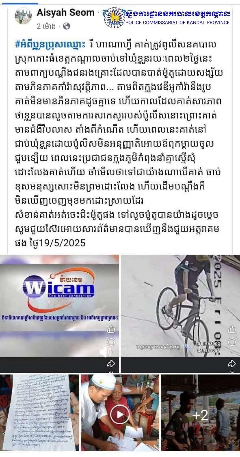 ក្រុមការងារព័ត៌មាន និងប្រតិកម្មរហ័ស នៃស្នងការដ្ឋាននគរបាលខេត្តកណ្តាល មានកិត្តិយសសូមជម្រាបជូនសាធារណជន និងបណ្តាញសារព័ត៌មានជ្រាបពាក់ព័ន្ធគណនីហ្វេសប៊ុកឈ្មោះ Aisyah Seom ដែលបានបង្ហោះមានខ្លឹមសារ (ដោយសរសេរមានខុសអក្ខរាវិរុទ្ធ)ថា៖ ***អំពីប្អូនប្រុសឈ្មោះ រី ហាណាហ្វី គាត់ត្រូវពូលីសនគរបាលស្រុកកោះធំ ខេត្តកណ្តាល ចាប់ទៅឃុំខ្លួនរយះពេល ២ថ្ងៃនេះ តាមពាក្យបណ្តឹងជនរងគ្រោះដែលបានបាត់ម៉ូតូដោយសង្ស័យតាមភិនភាគកាំរ៉ាសុវត្តិភាព តាមពិតក្នុងវីឌីអូកាំរ៉ានឹងរូបគាត់មិនមានភិនភាគដូចគ្នាទេ ហើយកាលដែលគាត់សារភាពថាខ្លួនបានលួចតាមការសាកសួររបស់ប៉ូលីសនោះគាត់នៅជាប់ឃុំខ្លួនដោយប៉ូលីសមិនអនុញ្ញាតអោយឪពុកម្តាយចូលជួបឡើយពេលនេះប្រជាជនក្នុងភូមិកំពុងនាំគ្នាស្នើសុំដោះលែងគាត់ហើយ ចាំមើលថាទៅជាយ៉ាងណាបើគាត់ចាប់ខុសមនុស្សសោះមិនព្រមដោះលែងហើយដើមបណ្តឹងក៏មិនឃើញចេញមុខមកដោះស្រាយដែរសំខាន់គាត់អត់ចេះជិះម៉ូតូផងទៅលួចម៉ូតូបានយ៉ាងដូចម្តេចសូមជួយស៊ែរអោយសារព័ត៌មានបានឃើញនឹងជួយអត្តរាគមផង ថ្ងៃ19/5/2025***។