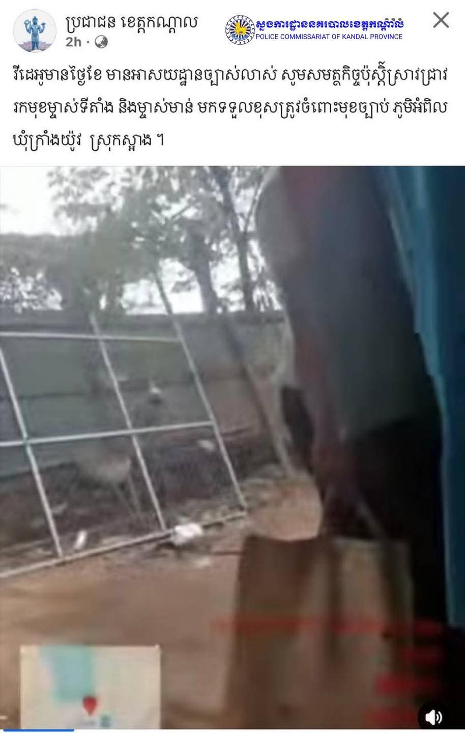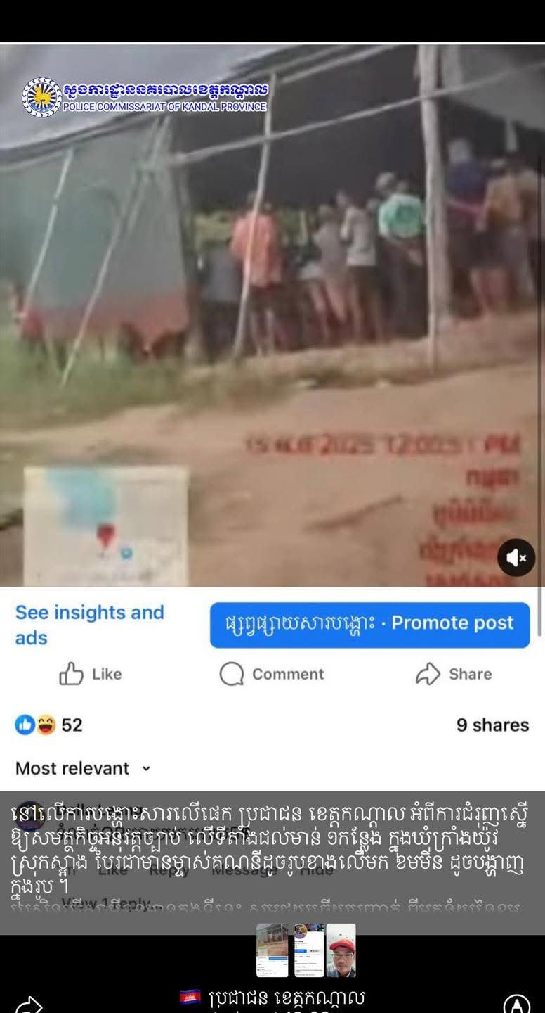 ក្រុមការងារព័ត៌មាន និងប្រតិកម្មរហ័ស នៃស្នងការដ្ឋាននគរបាលខេត្តកណ្តាល មានកិត្តិយសសូមធ្វើការឆ្លើយតបបំភ្លឺជូនសាធារណជន ពាក់ព័ន្ធការផ្សព្វផ្សាយវីដេអូលួចលាក់ ចូលក្នុងគ្រុប Telegram ប្រជាជនខេត្តកណ្ដាល អមដោយខ្លឹមសារថា៖ មានថ្ងៃខែមានអាស័យដ្ឋានច្បាស់លាស់ សូមសមត្ថកិច្ចប៉ុស្តិ៍ស្រាវជ្រាវរកមុខម្ចាស់ទីតាំង និងម្ចាស់មាន់មកទទួលខុសត្រូវចំពោះមុខច្បាប់ ភូមិអំពិល ឃុំក្រាំងយ៉ូវ ស្រុកស្អាង។