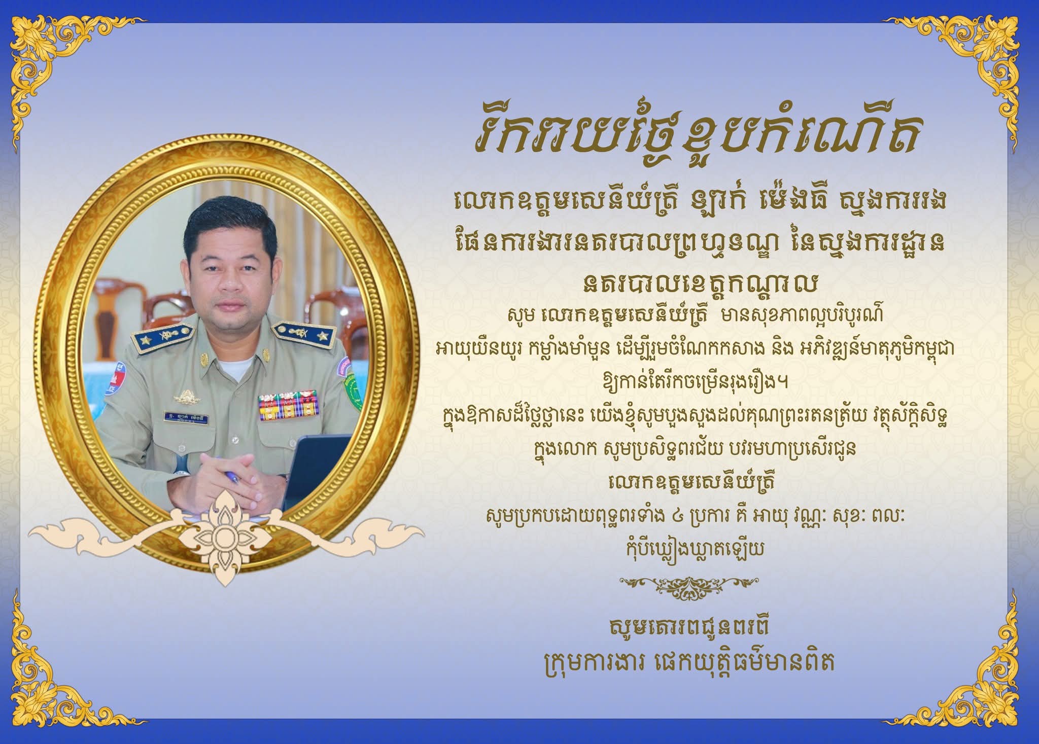 រីករាយថ្ងៃខួបកំណើត! លោកឧត្តមសេនីយ៍ត្រី ឡាក់ ម៉េងធី សូមគោរពជូនពរ លោកឧត្តមសេនីយ៍ត្រី ស្នងការរងនៃស្តង់ការដ្ឋាននគរបាលខេត្តកណ្ដាល សូមទទួលបាននូវសុខភាពល្អបរិបូរណ៌ ពោរពេញទៅដោយសុភមង្គលក្នុងគ្រួសារ សម្រេចបាននូវក្តីប្រាថ្នា និងទទួលបានជោគជ័យគ្រប់ភារកិច្ច និងពុទ្ធពរទាំងបួនប្រការអាយុ វណ្ណៈសុខៈពលៈកុំបីឃ្លៀងឃ្លាតឡើយ។