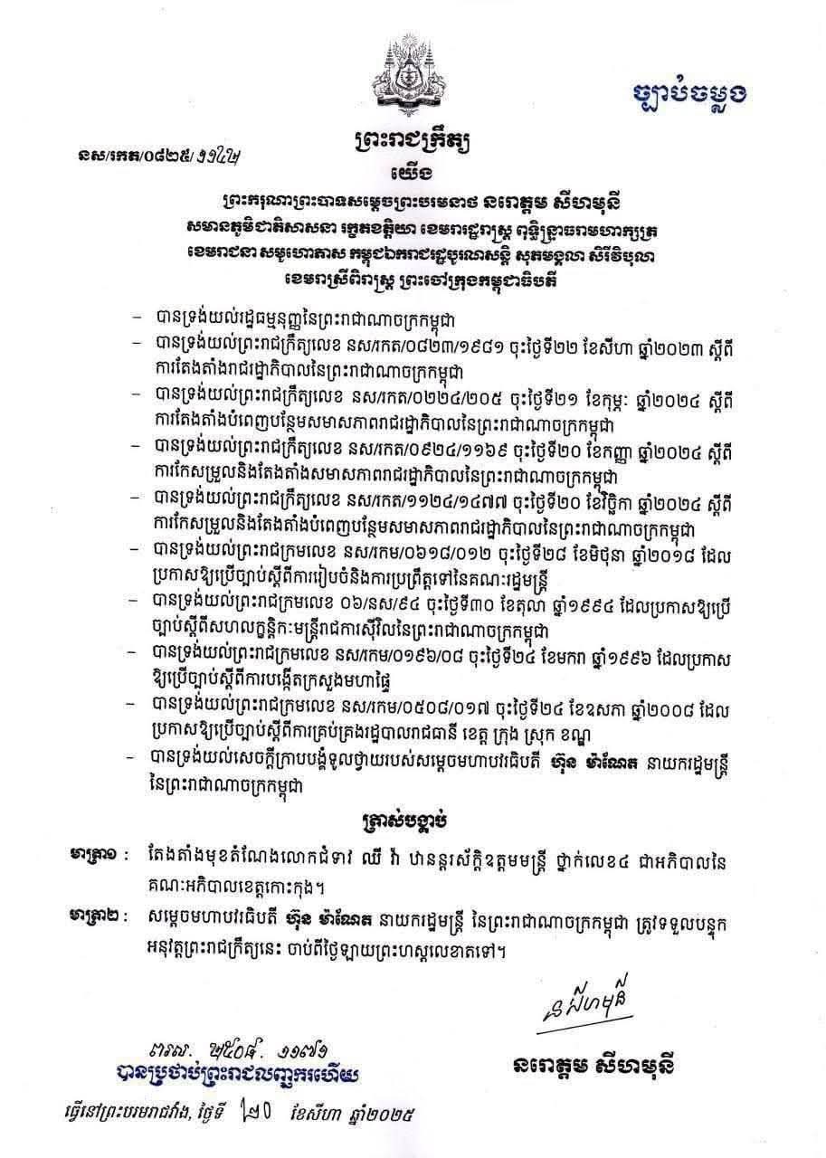 ព្រះរាជក្រឹត្យតែងតាំង លោកជំទាវ ឈី វ៉ា ជាអភិបាលនៃគណ:អភិបាលខេត្តកោះកុង ជំនួស លោកជំទាវ មិថុនា ភូថង ដែលនឹងត្រូវផ្ទេរទៅជារដ្ឋលេខាធិការ ក្រសួងកិច្ចការនារី។