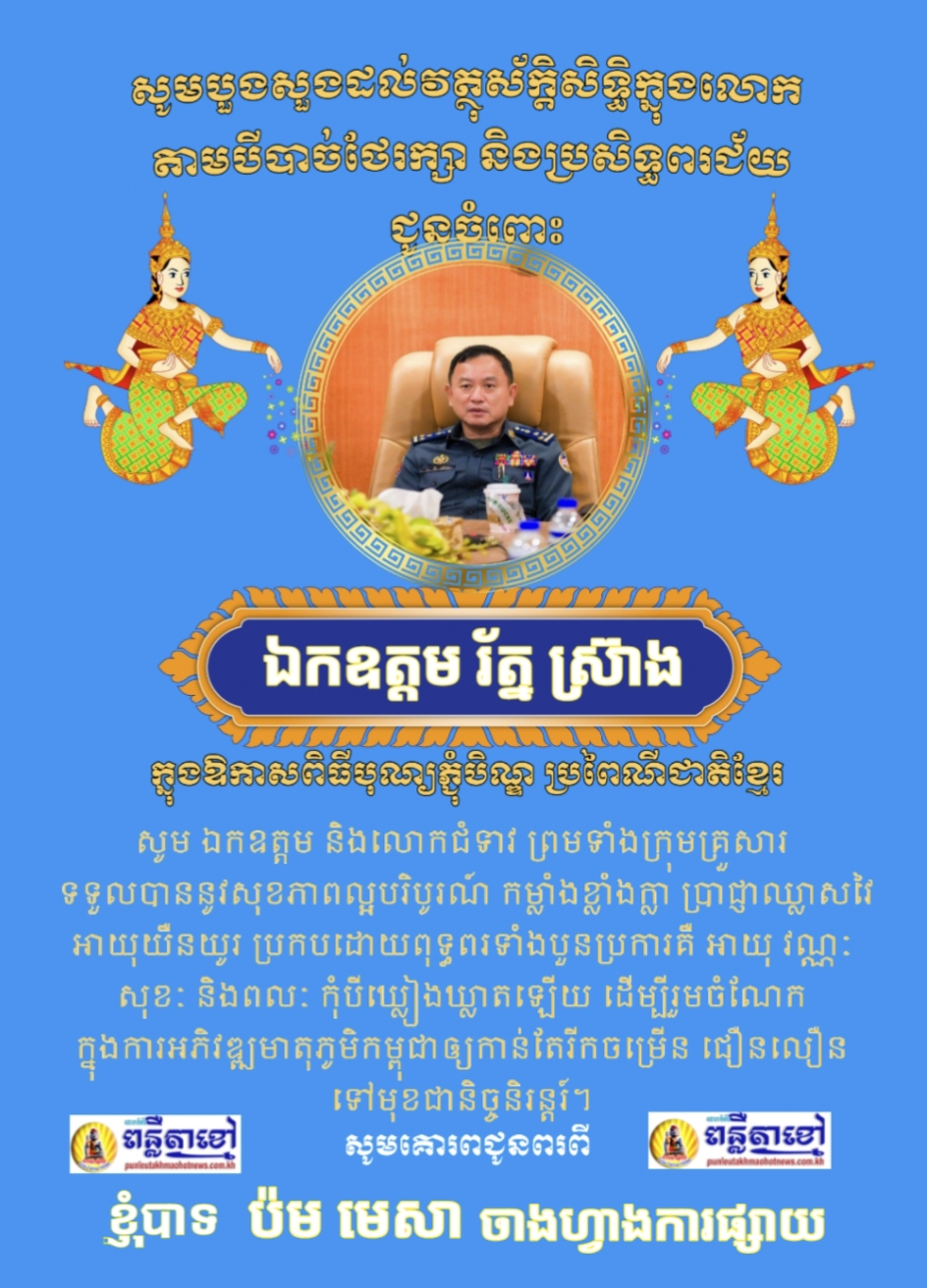 ខ្ញុំបាទ ប៉ម មេសា ចាងហ្វាងការផ្សាយគេទំព័រពន្លឺតាខ្មៅហតញូស៍ www.punleutakhmaohotnews.com.kh និងក្រុមគ្រួសារ ព្រមទាំងសហការីទាំងអស់ ក្នុងឨកាស បុណ្យកាន់បិណ្ឌនិងភ្ជំុបិណ្ឌ ប្រពៃណីជាតិខ្មែរយើង ខ្ញុំបាទ សូមបួងសួងដល់វត្ថុសាកសិទ្ធក្នុងលោក តាមបីបាច់ថែរក្សានិងប្រសិទ្ធពរជ័យជូនចំពោះ លោកឯកឧត្តមឧត្តមសេនីយ៍ឯក រ័ត្ន ស្រ៊ាង មេបញ្ជាការរងនៃកងរាជអាវុធហត្ថលើផ្ទៃប្រទេស និងមេបញ្ជាការកងរាជអាវុធហត្ថរាជធានីភ្នំពេញនិង លោកជំទាវ ព្រមទាំងក្រុមគ្រួសារ សូមមានសុខភាពល្អបរិបូណ៌កម្លាំងពុលមាំមួនប្រាជ្ញាឈ្លាសវៃ និងពុទ្ធពរបួនប្រការ អាយុ វណ្ណៈសុខៈពលៈ កុំបីភ្លៀងឃ្លាតឡើយ ដើម្បីបន្តការអភិវឌ្ឍនិងចូលរួមកសាងប្រទេសជាតិឲ្យកាន់តែរីកចម្រើនបន្តថែមទៀត។