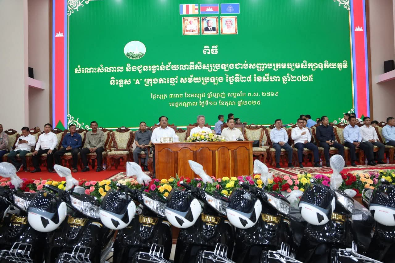 ខេត្តកណ្ដាល៖ ម៉ូតូចំនួន ៨០ គ្រឿង ត្រូវបានផ្ដល់ជូនសិស្សប្រឡងជាប់និទ្ទេស A សញ្ញាប័ត្រមធ្យមសិក្សាទុតិយភូមិ សម័យប្រឡងថ្ងៃទី២៨ ខែសីហា ឆ្នាំ២០២៥ ដោយឯកឧត្តម នូ សាខន ប្រធានក្រុមប្រឹក្សាខេត្តកណ្ដាល និងឯកឧត្តម គួច ចំរើន អភិបាល នៃគណៈអភិបាលខេត្តកណ្ដាល នាព្រឹកថ្ងៃទី១០ ខែតុលា ឆ្នាំ២០២៥នេះ។