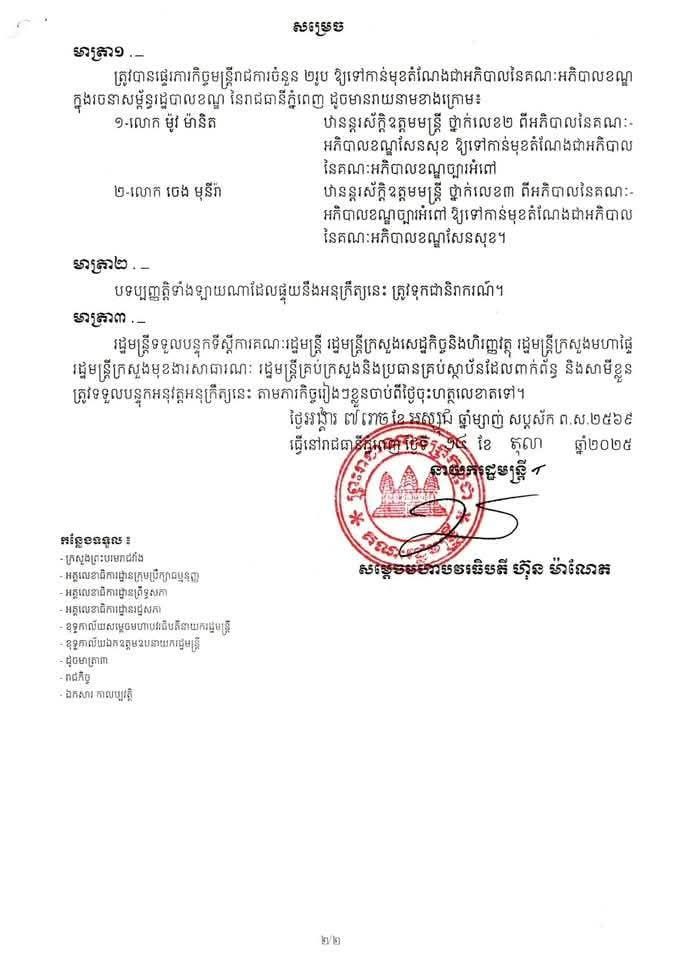 លោក ចេង មុន្នីរ៉ា អភិបាលខណ្ឌច្បារអំពៅបានផ្លាស់ប្ដូរទៅជាអភិបាលខណ្ឌសែនសុខលោក ម៉ូវ ម៉ានិចអភិបាលខណ្ឌសែនសុខផ្លាស់ប្ដូរមកជាអភិបាលខណ្ឌច្បារអំពៅ។