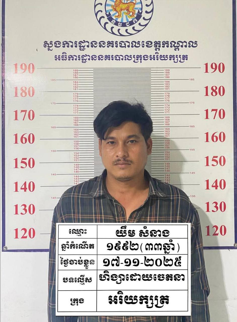 ៤.ឈ្មោះ យឹម សំនៀង ភេទប្រុស អាយុ៣៣ឆ្នាំ ជនជាតិខ្មែរ មុខរបរកសិករ មានទីលំនៅបច្ចុប្បន្នភូមិអរិយក្សត្រ សង្កាត់អរិយក្សត្រ ក្រុងអរិយក្សត្រ ខេត្ដកណ្ដាល។ ឃាត់ខ្លួន