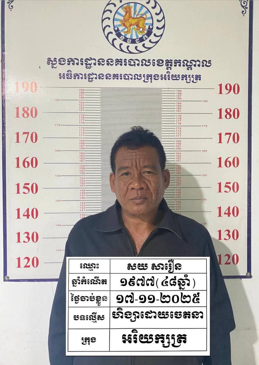 ២.ឈ្មោះ សយ សារឿន ភេទប្រុស អាយុ៤៨ឆ្នាំ ជនជាតិខ្មែរ មុខរបរកសិករ មានទីលំនៅបច្ចុប្បន្នភូមិតាជោ សង្កាត់សារិកាកែវ ក្រុងអរិយក្សត្រ ខេត្ដកណ្ដាល។ ឃាត់ខ្លួន