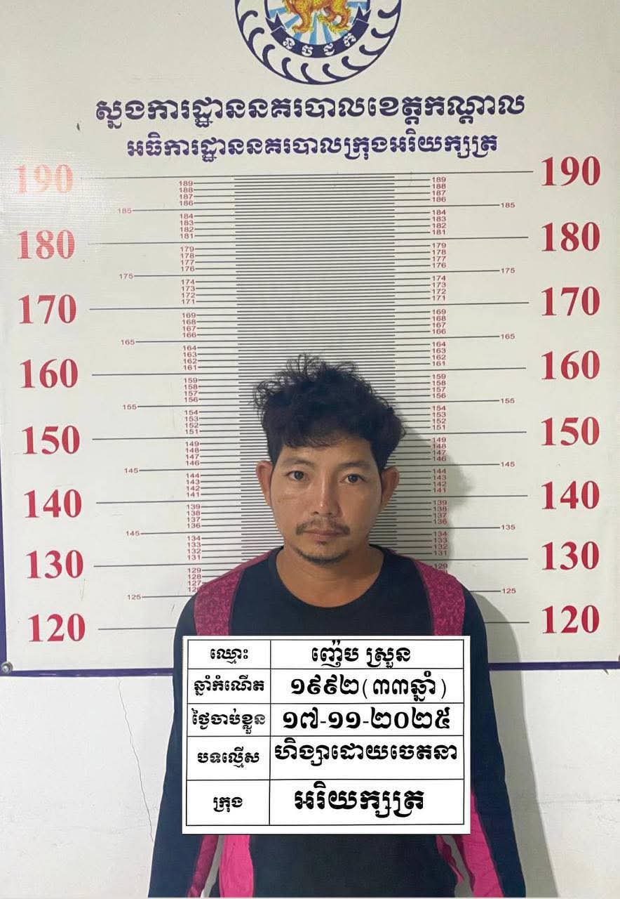 ៣.ឈ្មោះ ញ៉េប ស្រួន ហៅក្រៅ ទ្រូ ភេទប្រុស អាយុ៣៣ឆ្នាំ ជនជាតិខ្មែរ មុខរបរកសិករ មានទីលំនៅបច្ចុប្បន្នភូមិព្រែកបង្កង សង្កាត់ព្រែកតាកូវ ក្រុងអរិយក្សត្រ ខេត្ដកណ្ដាល។ ឃាត់ខ្លួន