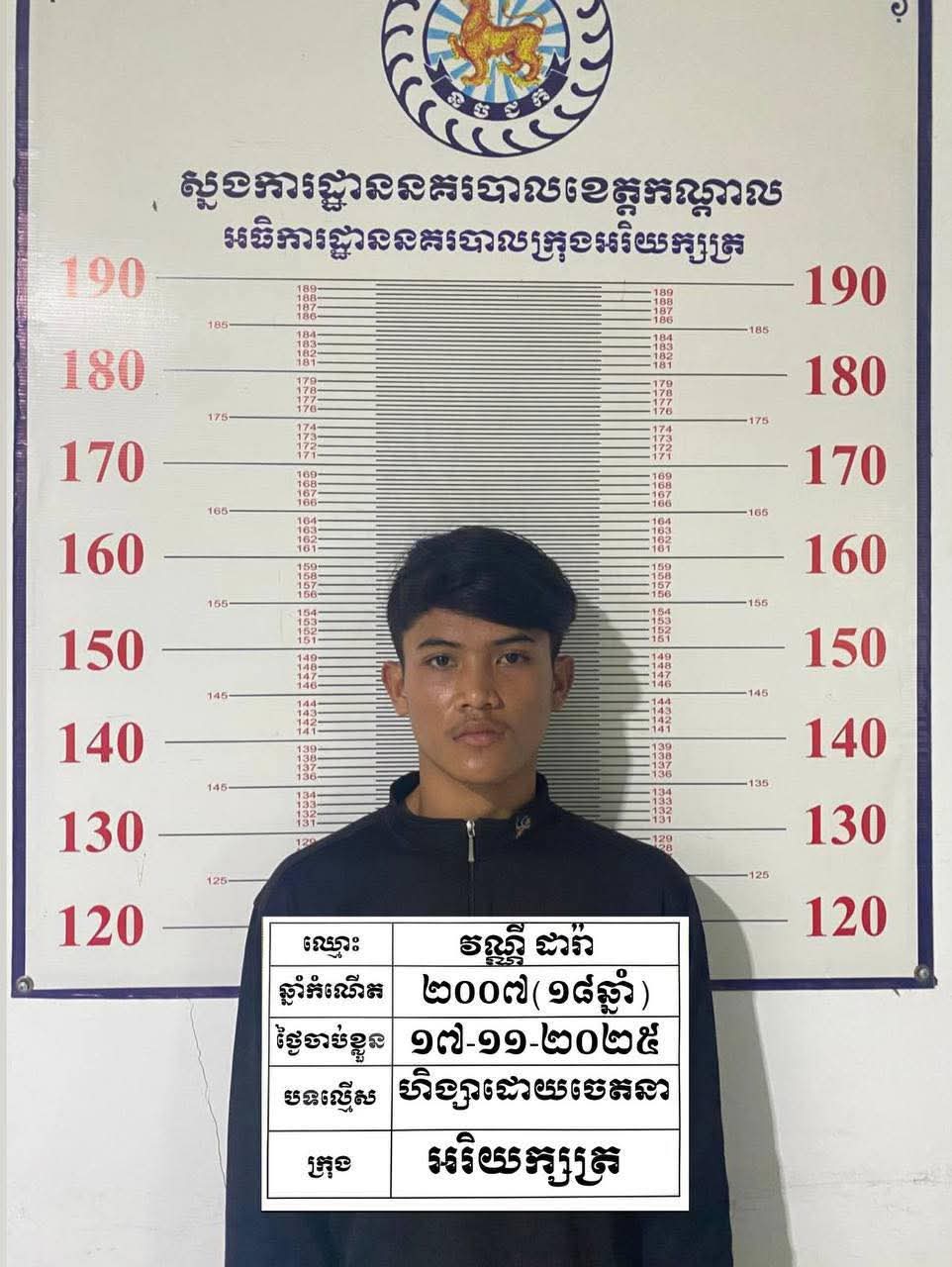 ៥.ឈ្មោះ វណ្ណី ដារ៉ា ភេទប្រុស អាយុ១៨ឆ្នាំ ជនជាតិខ្មែរ មុខរបរ កម្មករសំណង់ មានទីលំនៅបច្ចុប្បន្នភូមិព្រែកល្វា សង្កាត់ព្រែកតាកូវ ក្រុងអរិយក្សត្រ ខេត្ដកណ្ដាល។ ឃាត់ខ្លួន