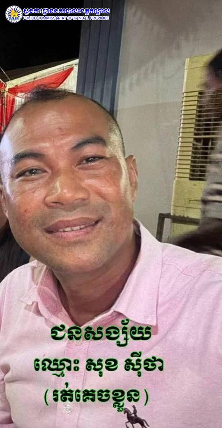 ១.ឈ្មោះ សុខ ស៊ីថា ភេទប្រុស អាយុ៤៦ឆ្នាំ ជនជាតិខ្មែរ មុខរបរ នគរបាល មានទីលំនៅបច្ចុប្បន្នភូមិបឹងក្រចាប់ជើង ឃុំព្រែកតាមាក់ ស្រុកខ្សាច់កណ្តាល ខេត្ដកណ្ដាល (ជនដៃដល់) ។ (គេចខ្លួន)