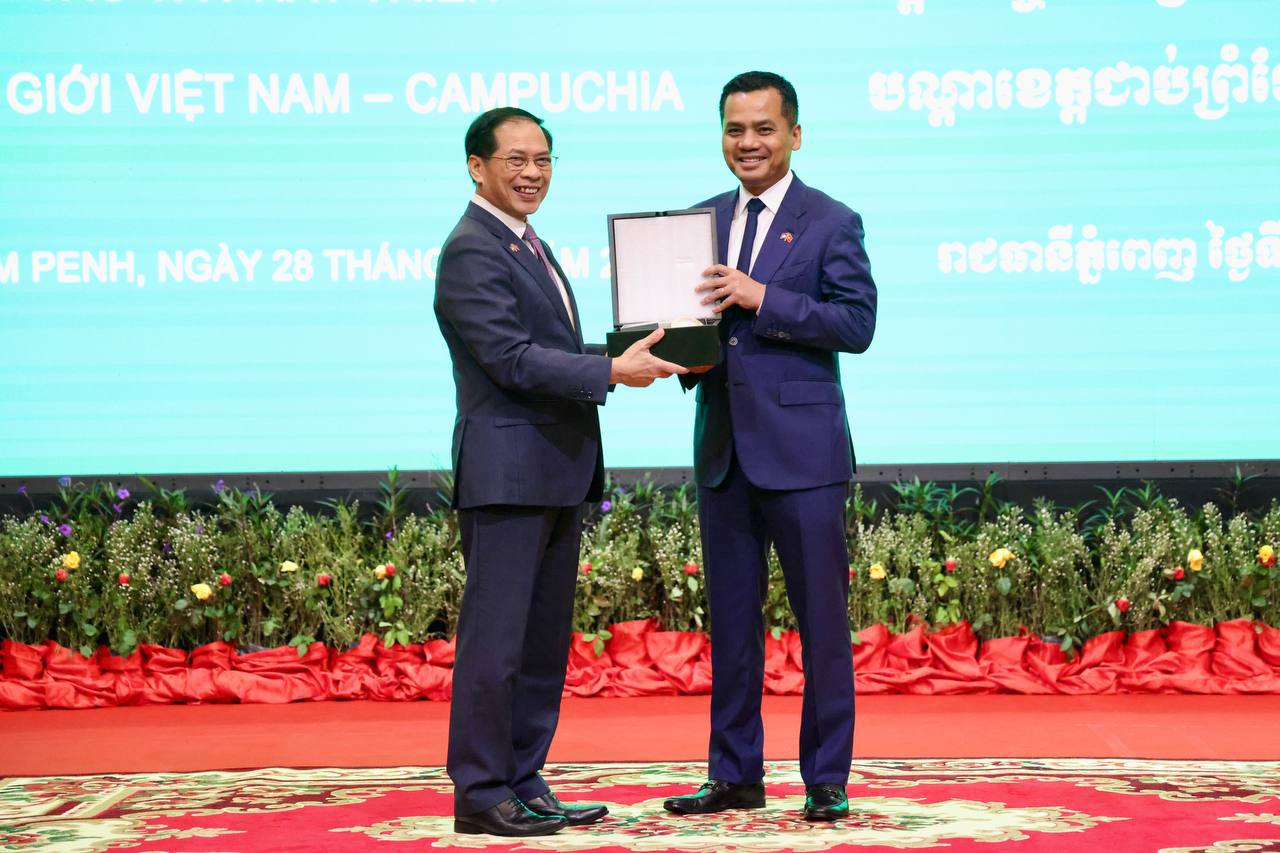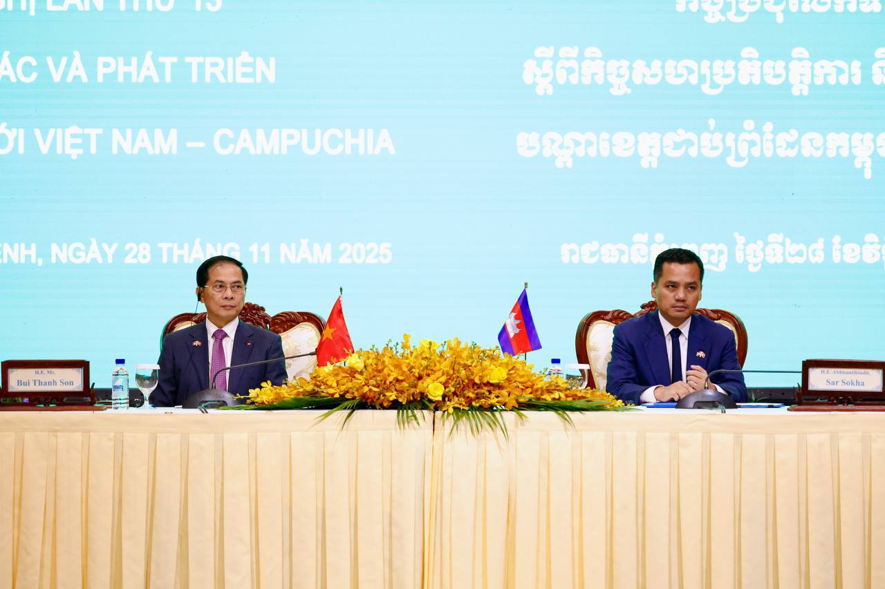 រសៀលថ្ងៃសុក្រ ទី២៨ ខែវិច្ឆិកា ឆ្នាំ២០២៥ នេះ ឯកឧត្តមអភិសន្តិបណ្ឌិត ស សុខា ឧបនាយករដ្ឋមន្ត្រី រដ្ឋមន្ត្រីក្រសួងមហាផ្ទៃ និងជាប្រធានគណៈប្រតិភូ នៃព្រះរាជាណាចក្រកម្ពុជា បានអញ្ជើញជាសហអធិបតីជាមួយឯកឧត្តម ប៊ួយ ថាញ់សឺន (Bui Thanh Son) ឧបនាយករដ្ឋមន្ត្រី នៃសាធារណរដ្ឋសង្គមនិយមវៀតណាម ដឹកនាំកិច្ចប្រជុំលើកទី១៣ ស្តីពីកិច្ចសហប្រតិបត្តិការ និងការអភិវឌ្ឍបណ្តាខេត្តជាប់ព្រំដែនកម្ពុជា-វៀតណាម នៅសណ្ឋាគារ រ៉េស៊ីដង់ សុខាភ្នំពេញ រាជធានីភ្នំពេញ។