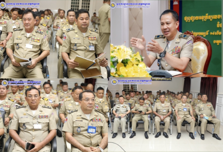 ដោយអនុវត្តតាមការដឹកនាំបញ្ជាដ៏ខ្ពង់ខ្ពស់របស់ ឯកឧត្តម នាយឧត្តមសេនីយ៍ ស ថេត អគ្គស្នងការនគរបាលជាតិ លោកឧត្តមសេនីយ៍ទោ ឈឿន សុចិត្ត ស្នងការនគរបាលខេត្តកណ្តាល បានអញ្ជើញជាអធិបតីដឹកនាំកិច្ចប្រជុំផ្សព្វផ្សាយអនុក្រឹត្យស្តីពីឯកសណ្ឋាន សញ្ញាសម្គាល់ និងទង់នគរបាលជាតិកម្ពុជា នៅសាលប្រជុំស្នងការដ្ឋាននគរបាលខេត្តកណ្តាល សមាសភាពចូលរួមមាន៖ លោកស្នងការរង, លោក-លោកស្រី នាយការិយាល័យជំនាញទាំង៣១ លោកអធិការនគរបាលគ្រប់ស្រុក/ក្រុង លោកមេបញ្ជាការវរៈសេនាតូចនគរបាលការពារព្រំដែនគោកលេខ៦០៥ និងលោកប្រធានប៉ុស្តិ៍នគរបាលច្រកទ្វារអន្តរជាតិជ្រៃធំ និងលោកនាយប៉ុស្តិ៍នគរបាលរដ្ឋបាលទាំង១០ ចំណុះអធិការដ្ឋាននគរបាលក្រុងតាខ្មៅ។