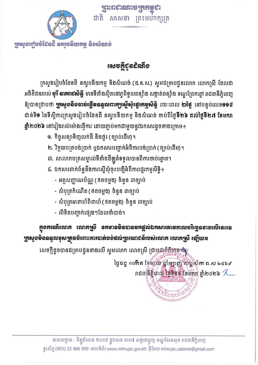 ក្រសួងរៀបចំដែនដី នគរូបនីយកម្ម និងសំណង់ (ដ.ន.ស.) សូមជម្រាបជូនលោក លោកស្រី ដែលជា អតិថិជនរបស់ បុរី នាគរាជសិទ្ធី មានទីតាំងស្ថិតនៅ ភូមិទួលពន្សាំង សង្កាត់ពន្សាំង ខណ្ឌព្រែកព្នៅ រាជធានីភ្នំពេញ ឱ្យបានជ្រាបថា ក្រសួងនឹងចាប់ផ្តើមទទួលពាក្យស្នើសុំផ្ទេរកម្មសិទ្ធិ រយៈពេល ២ថ្ងៃ នៅទីតាំងនិងពេលវេលាដូចខាងក្រោម៖