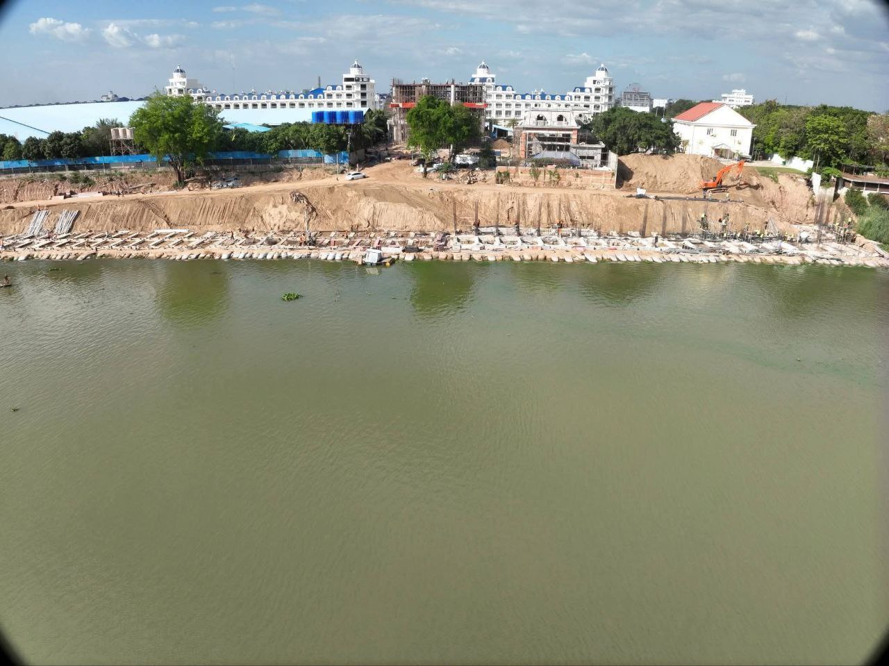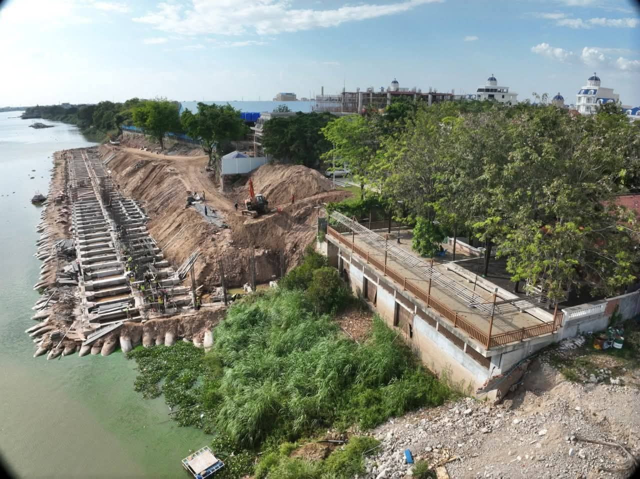 ឯកឧត្តមរដ្ឋលេខាធិការប្រចាំការ បានមានប្រសាសន៍ឱ្យដឹងថា សំណង់ការពារច្រាំងទន្លេនេះ ជាការវិនិយោគដោយវិស័យឯកជនក្នុងគោលបំណងការពារការបាក់ច្រាំង ដែលមានប្រវែងសរុប ២២០ម៉ែត្រ។ បច្ចុប្បន្ន សំណង់សម្រេចបានលទ្ធផលប្រមាណ ៨ភាគរយ ដោយទទួលបានការឯកភាពជាគោលការណ៍ពីរដ្ឋបាលរាជធានីភ្នំពេញ កាលពីថ្ងៃទី៣ ខែធ្នូ ឆ្នាំ២០២៥ កន្លងទៅ ប៉ុន្តែពុំទាន់មានការអនុញ្ញាតផ្នែកបច្ចេកទេសពីក្រសួងធនធានទឹក និងឧតុនិយមនៅឡើយទេ។