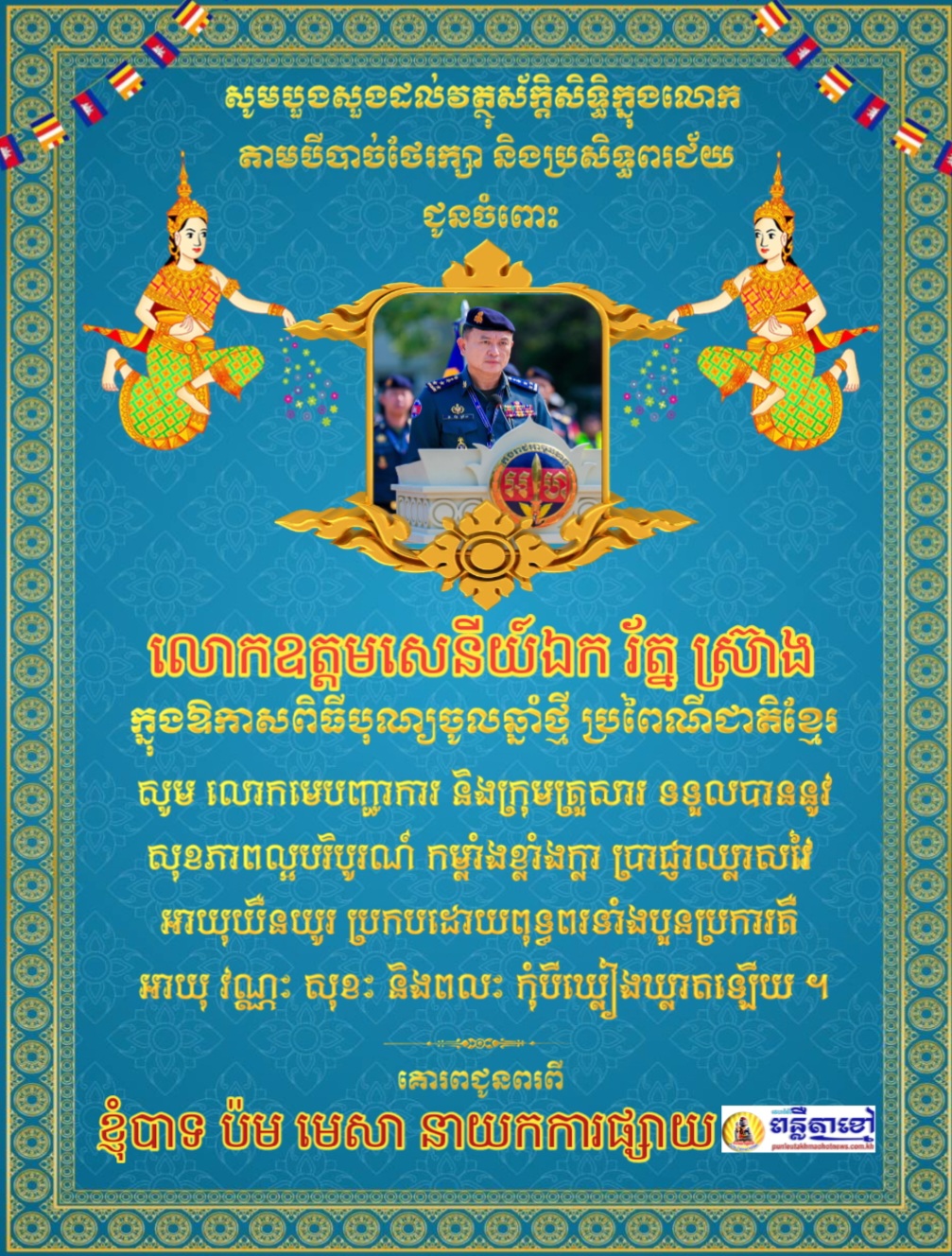 ខ្ញុំបាទរួមទាំងសហការីទាំងអស់ក្នុងឱកាសពិធីបុណ្យចូលឆ្នាំថ្មីប្រពៃណីជាតិខ្មែរយើង ខ្ញុំបាទសូមគោរពជូនពរ លោកឧត្តមសេនីយ៍ឯក រ័ត្ន ស្រ៊ាង មេបញ្ជាការរងនៃកងរាជអាវុធហត្ថលើផ្ទៃប្រទេស និងជាមេបញ្ជាការដ្ឋានកងរាជអាវុធហត្ថរាជធានីភ្នំពេញ រួមទាំង លោកជំទាវ ព្រមទាំងក្រុមគ្រួសារ សូមមានសុខភាពល្អបរិបូណ៌កម្លាំងពុលមាំមួនប្រាជ្ញាឈ្លាសវៃ ដើម្បីចូលរួមកសាងនិងអភិវឌ្ឍន៍ប្រទេសជាតិក្រោមម្លប់សន្តិភាពដើម្បីឲ្យកាន់តែរីកចម្រើនបន្តថែមទៀត។