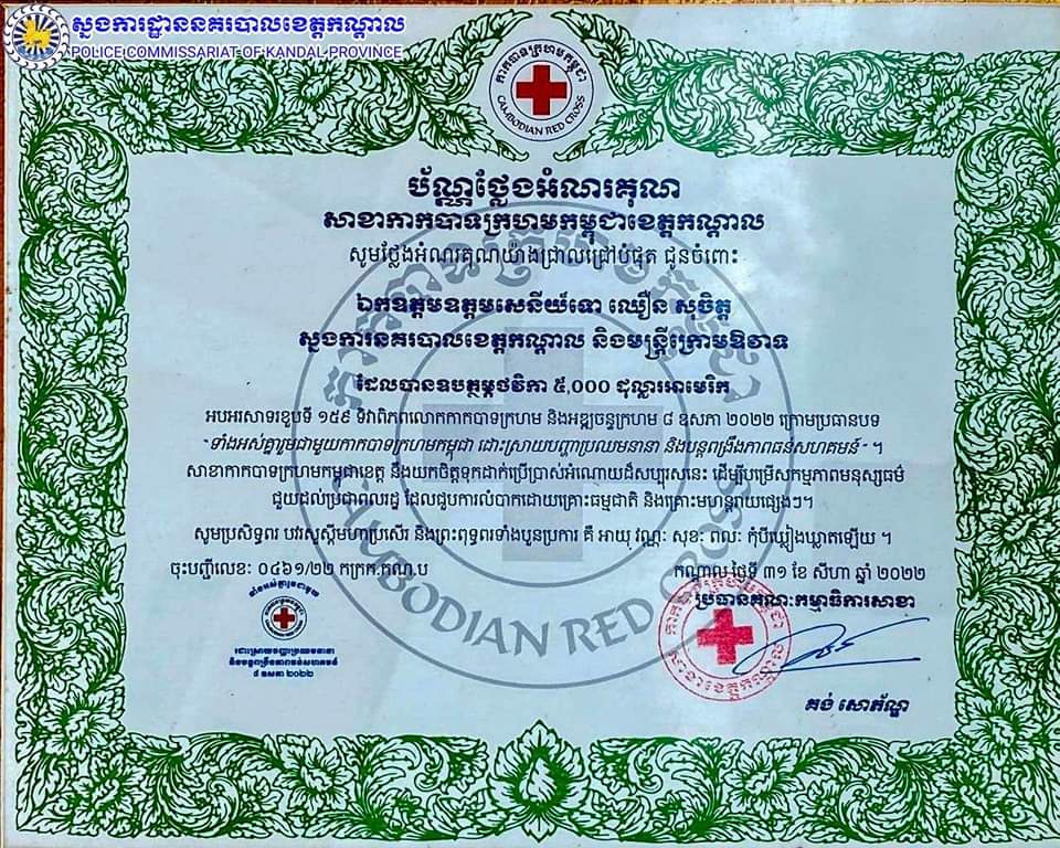 លោកឧត្តមសេនីយ៍ទោ ឈឿន សុចិត្ត ស្នងការនគរបាលខេត្តកណ្តាល បានដឹកនាំលោក-លោកស្រីស្នងការរង ចូលរួមពិធីប្រគល់ថវិកាចំនួន ៥,០០០ ដុល្លារសហរដ្ឋអាមេរិក ជូនទៅសាខាកាកបាទក្រហមកម្ពុជាប្រចាំខេត្តកណ្តាល ដែលមានឯកឧត្តម គង់ សោភ័ណ្ឌ អភិបាលខេត្តកណ្តាល ជាប្រធាន ដើម្បីយកទៅបម្រើជួយសង្គ្រោះបងប្អូនប្រជាពលរដ្ឋដែលងាយរងគ្រោះបំផុត និងជនរងគ្រោះដោយសារគ្រោះមហន្តរាយផ្សេងៗ។